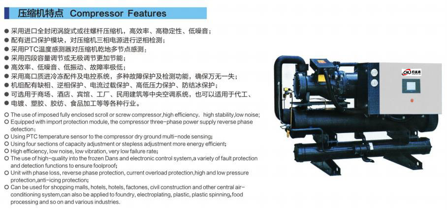 采用進口全封閉渦旋式或往螺桿壓縮機,高效率、高穩定性、低噪音;配有進口保護模塊,對壓縮機三相電源進行逆相檢測; 采用PTC溫度感測器對壓縮機乾地多節點感測: