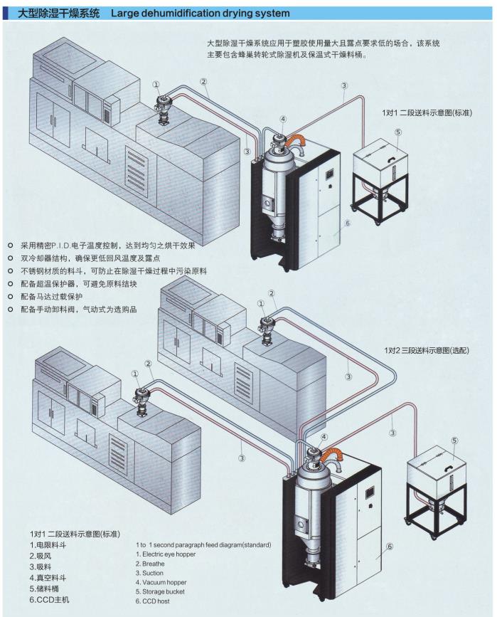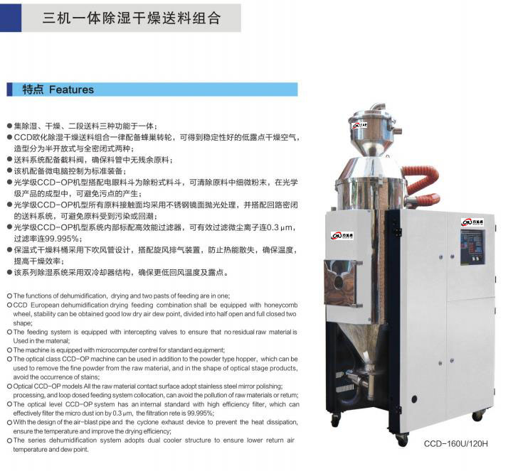 集除濕、干燥、二段送料三種功能于一體; CCD歐化除濕干燥送料組合一律配備蜂巢轉輪,可得到穩定性好的低露點干燥空氣,造型分為半開放式與全密閉式兩種;